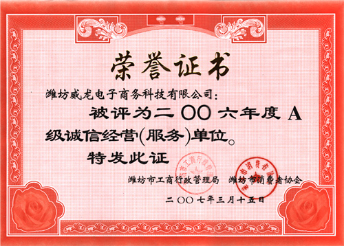 業(yè)經公司全體干部員工的共同努力,以及廣大客戶和各級領導的大力支持,我司在2007年3月15日來臨之際榮獲濰坊市工商局和濰坊市消費者協(xié)會共同頒發(fā)的誠信經營單位獎牌。這是對我司過去五年來經營歷程所給予的高度評價。我司也會在以后工作當中,進一步增強保護消費者合法權益的責任感和使命感,按照消費者協(xié)會提出的“消費和諧”的主題,抓住有利時機,加強隊伍建設,繼續(xù)為創(chuàng)造和諧的社會市場、促進電子商務的發(fā)展,做出我們最大的努力!