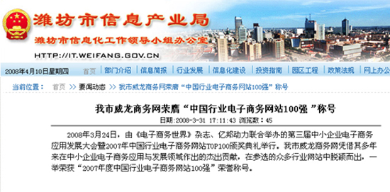 威龍商務(wù)網(wǎng)上榜“2007中國(guó)行業(yè)電子商務(wù)網(wǎng)站100強(qiáng)”